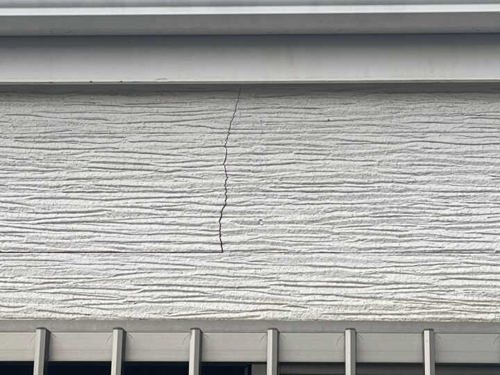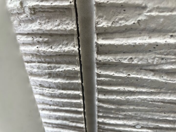 ひび割れ(クラック)が発生しています。塗膜の防水機能が低下し、内部への水分の浸入が懸念されます。シーリング劣化