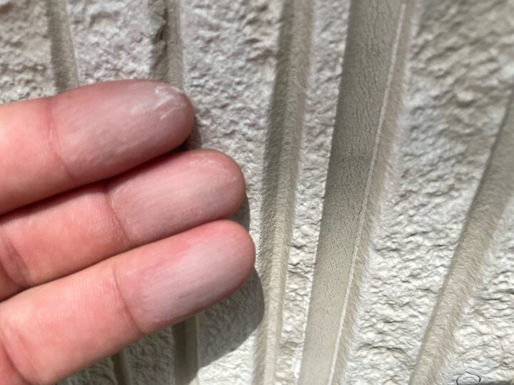 日本語では白亜化(はくあか)とも言い、主に塗装表面が暴露状態の際に紫外線・熱・水分・風等により塗装面の表層樹脂が劣化し、塗料の色成分の顔料がチョーク(白墨)のような粉状になって現れる現象。塗膜の樹脂が劣化して、顔料が析出している状態です。外壁ひび割れ