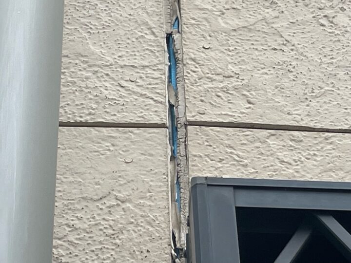 シーリングが硬くなっている状態であり、割れると雨水の浸入経路になります。隙間から入った水分を外壁が含み、そのあと乾くという状態を繰り返すと、外壁材の反り、剥離、内部への漏水に繋がるため、シーリングを打ち換えた上で、塗り替えによって大切な建物を保護することをお勧め致します。 -
